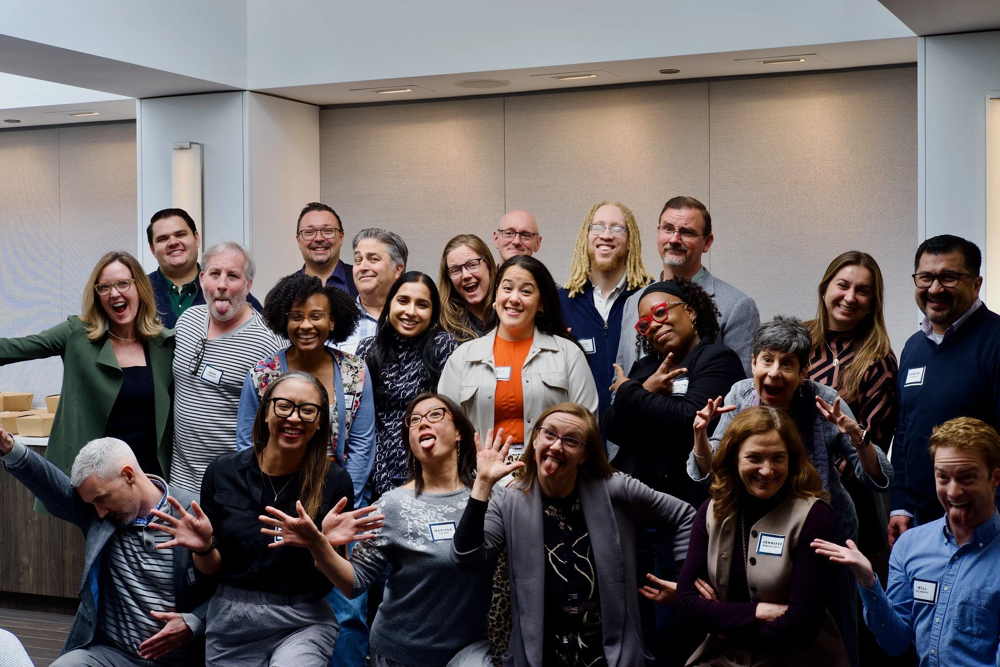A diverse group of people posing together at an indoor event, smiling and making playful gestures.