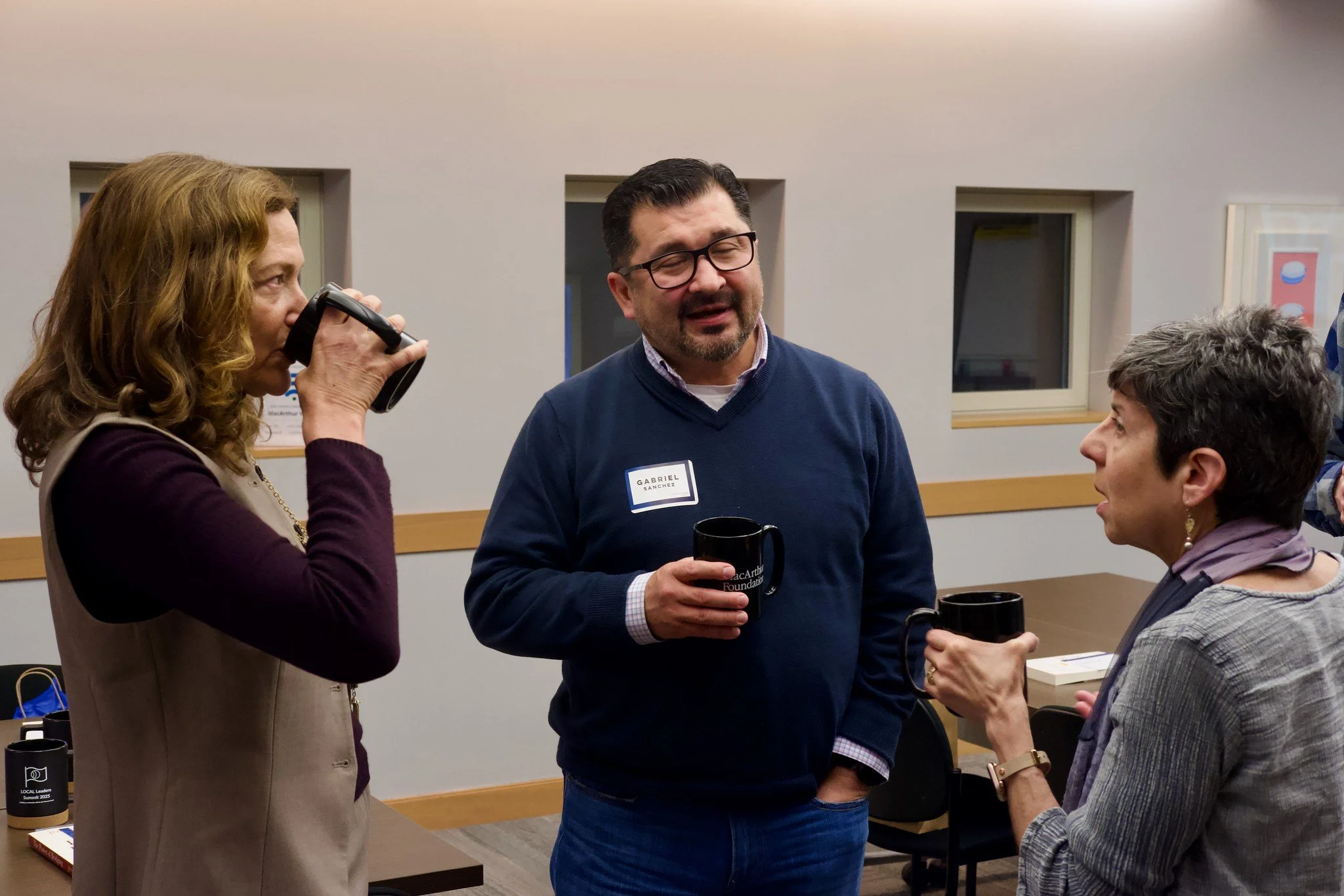 Three people talking at a social event, one woman drinking coffee, a man with glasses and a woman with short gray hair holding mugs.